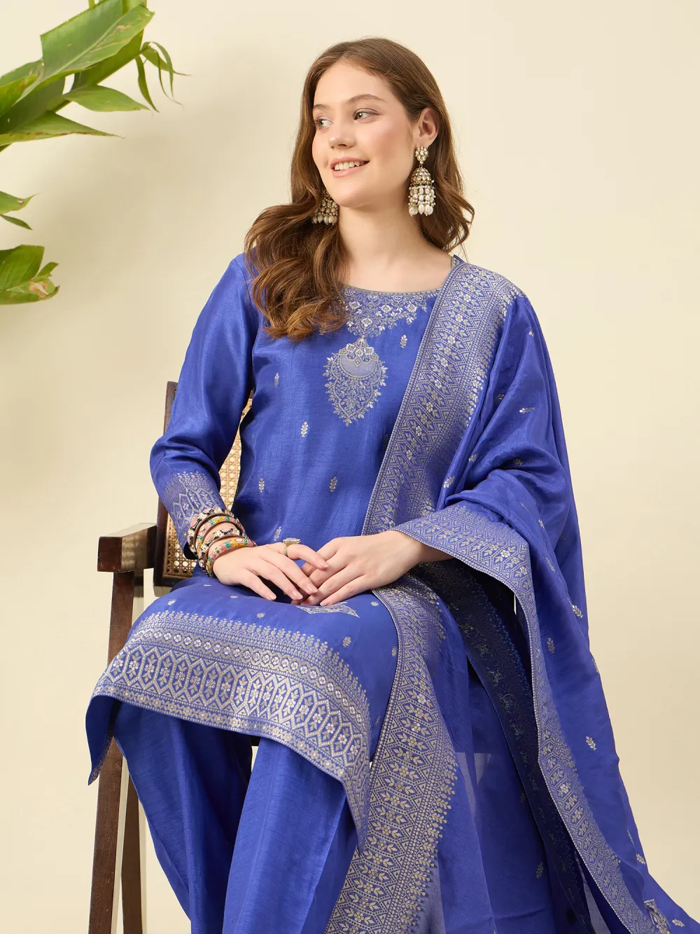 A timeless classic, this blue kurta set in luxurious Banarasi silk showcases the richness of traditional weave. It exudes elegance and cultural charm, making it perfect for festive occasions. This ensemble brings heritage craftsmanship to life with a refined, contemporary appeal.