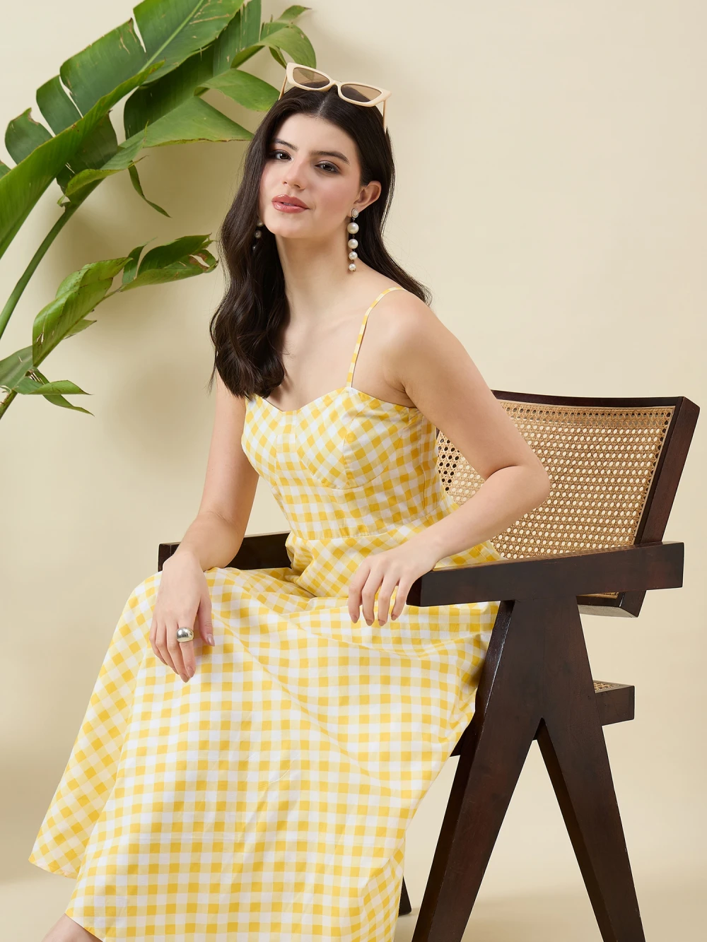 White and Yellow Cotton Dress features crisp gingham checks in a refreshing palette. Crafted from breathable cotton, it offers all-day comfort with a touch of effortless charm. Perfect for sunny outings, brunches, or casual gatherings, this dress is a breezy summer essential.