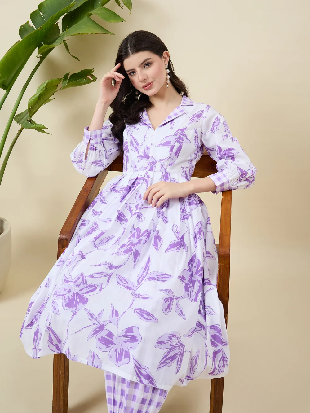 Lavender Kurta Set is crafted from breathable cotton and adorned with delicate floral prints. Its soothing hue and comfortable fit make it perfect for daytime events or casual gatherings, offering a gentle blend of elegance and effortless charm for every occasion.