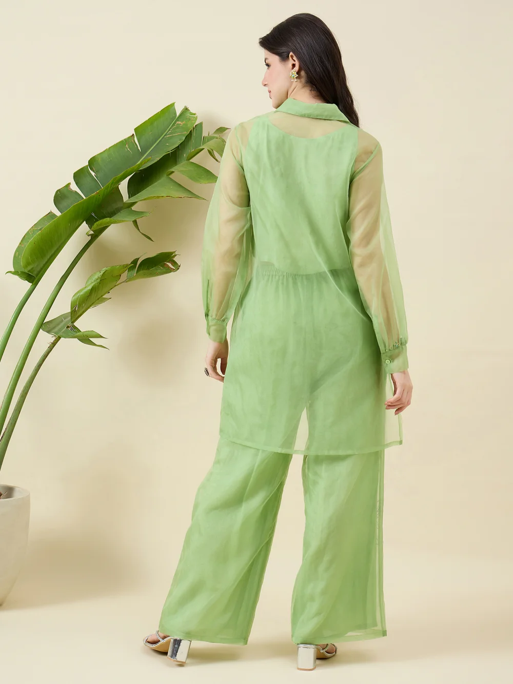 Ther Co-ord Set in pista green organza blends elegance with ease. Featuring delicate resham embroidery, this breezy ensemble exudes grace and charm. Perfect for festive occasions or daytime soirees, its soft silhouette and pastel hue make it a timeless choice for refined, contemporary dressing.