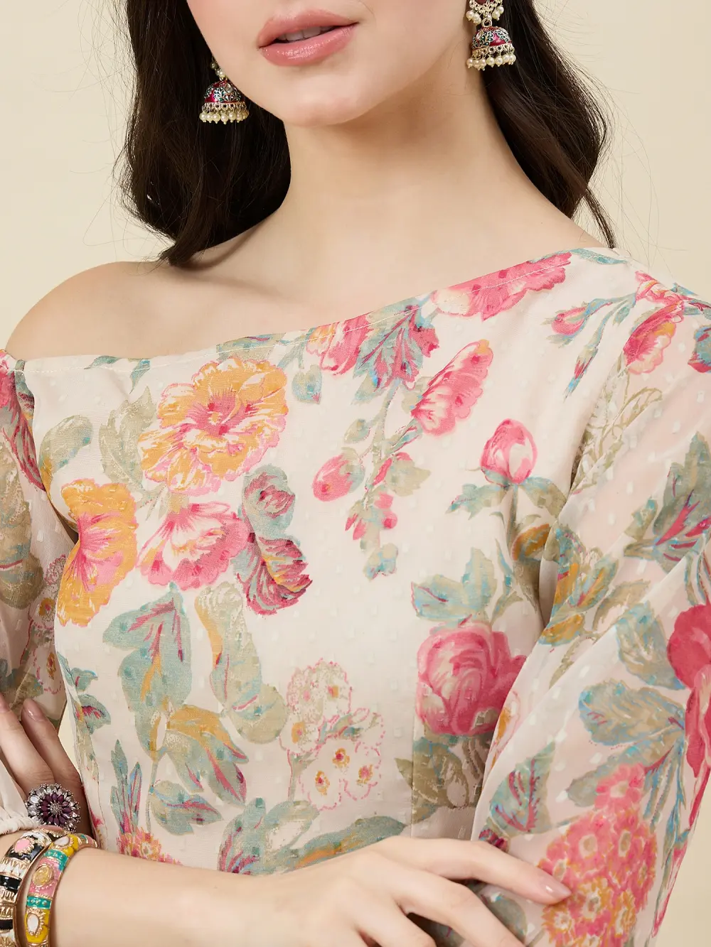 Printed Beige Co-ord Set in organza features delicate multicolour floral prints. The breezy silhouette and subtle sheen offer a perfect balance of comfort and elegance. Ideal for daytime outings or festive brunches, this ensemble brings effortless charm to your contemporary wardrobe.