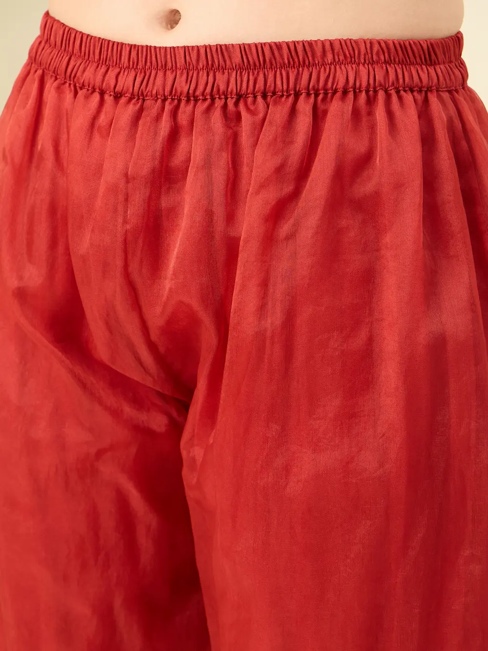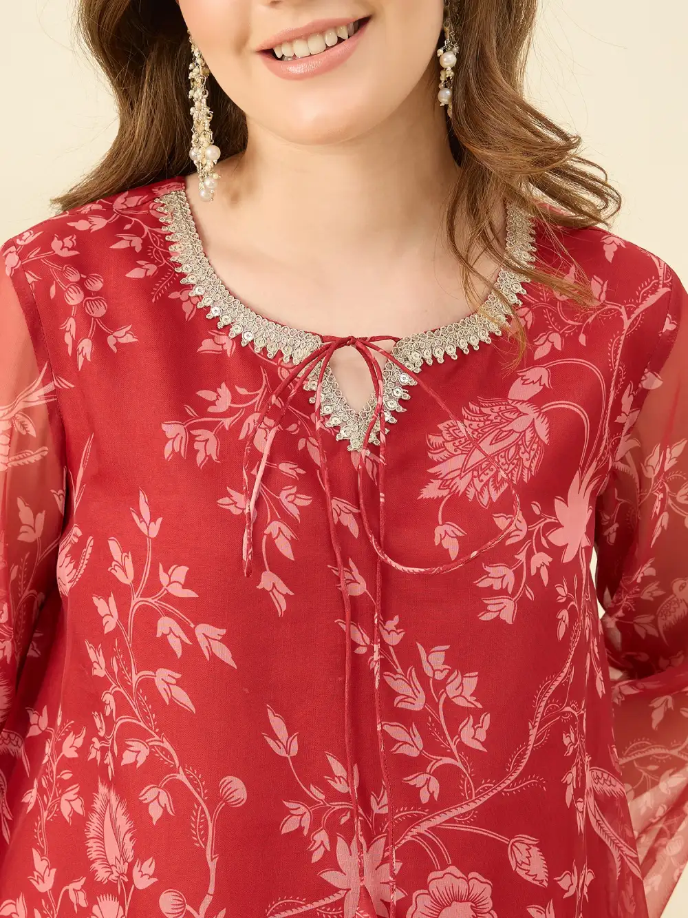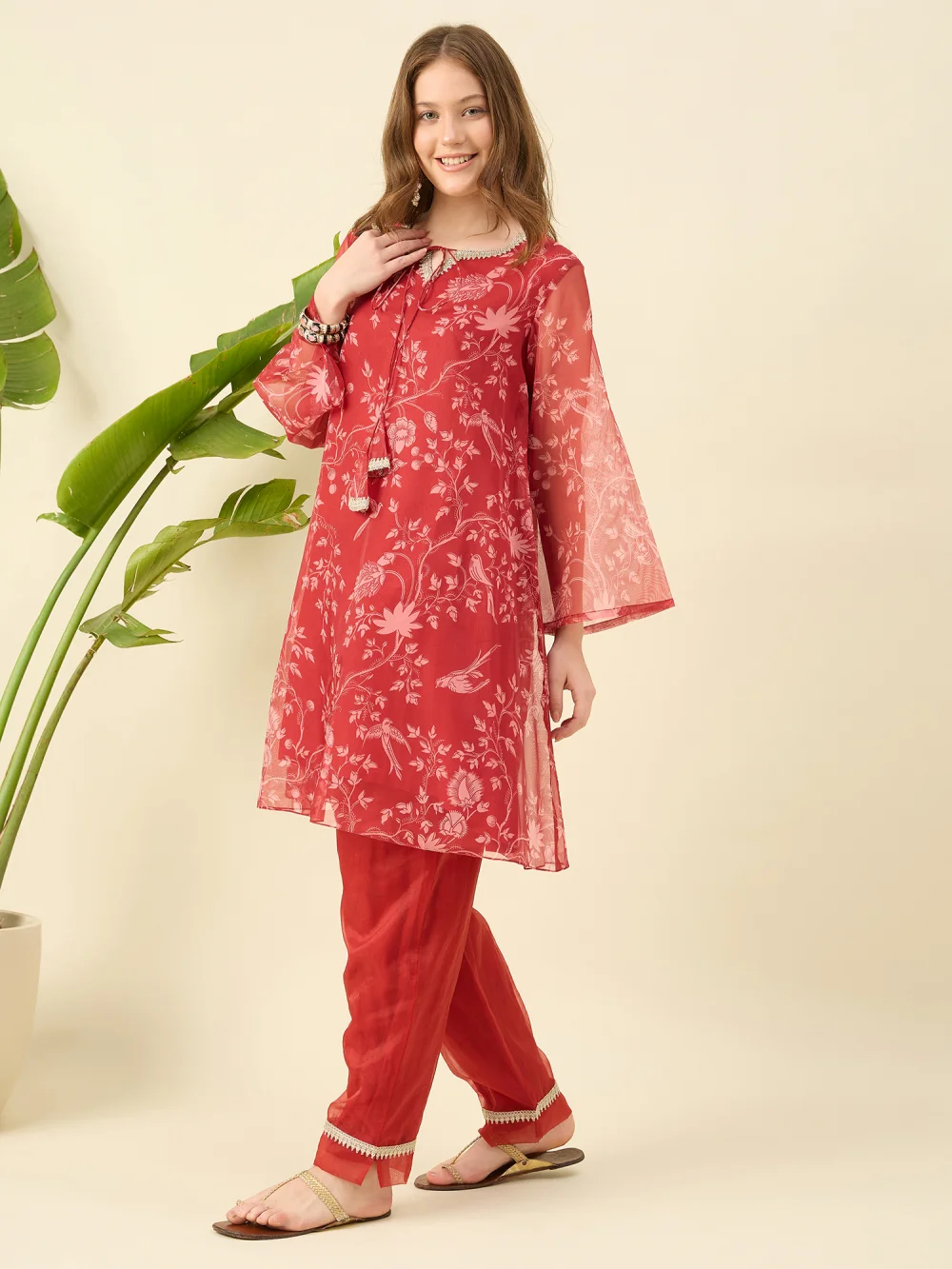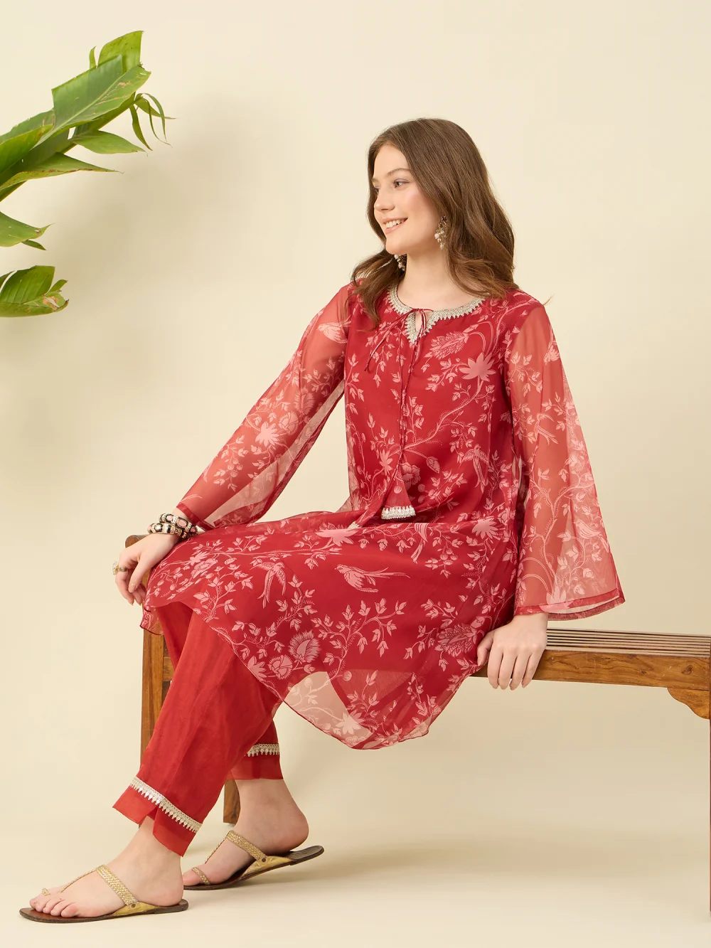 Red pairs the lightness of organza with the comfort of cotton. Featuring elegant prints and delicate lace detailing, this ensemble is perfect for festive days or elegant lunches—a beautiful balance of tradition and ease, wrapped in a bold, striking hue.