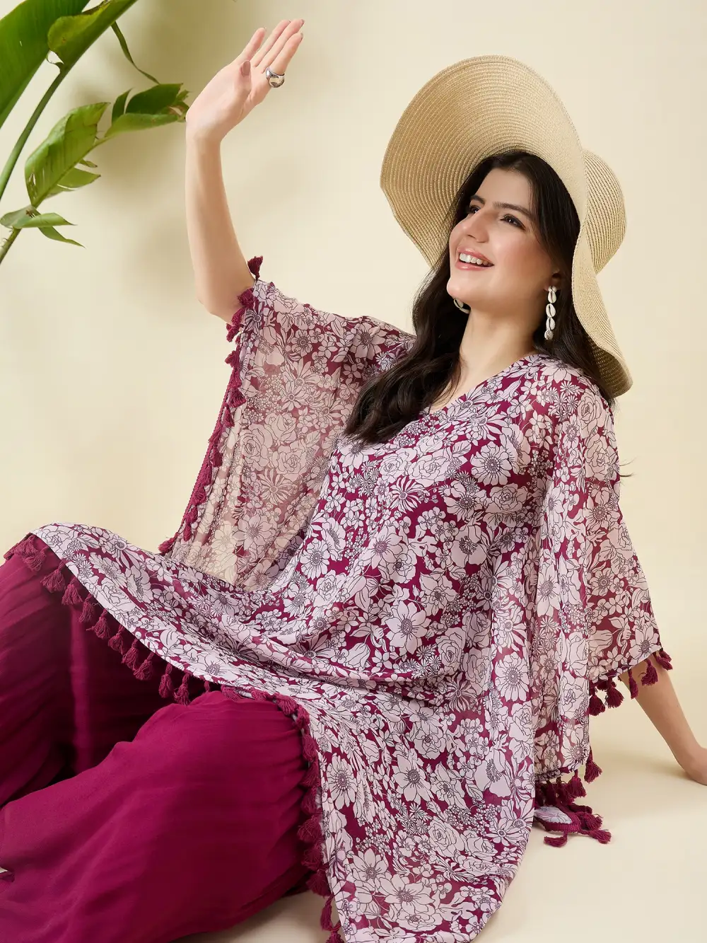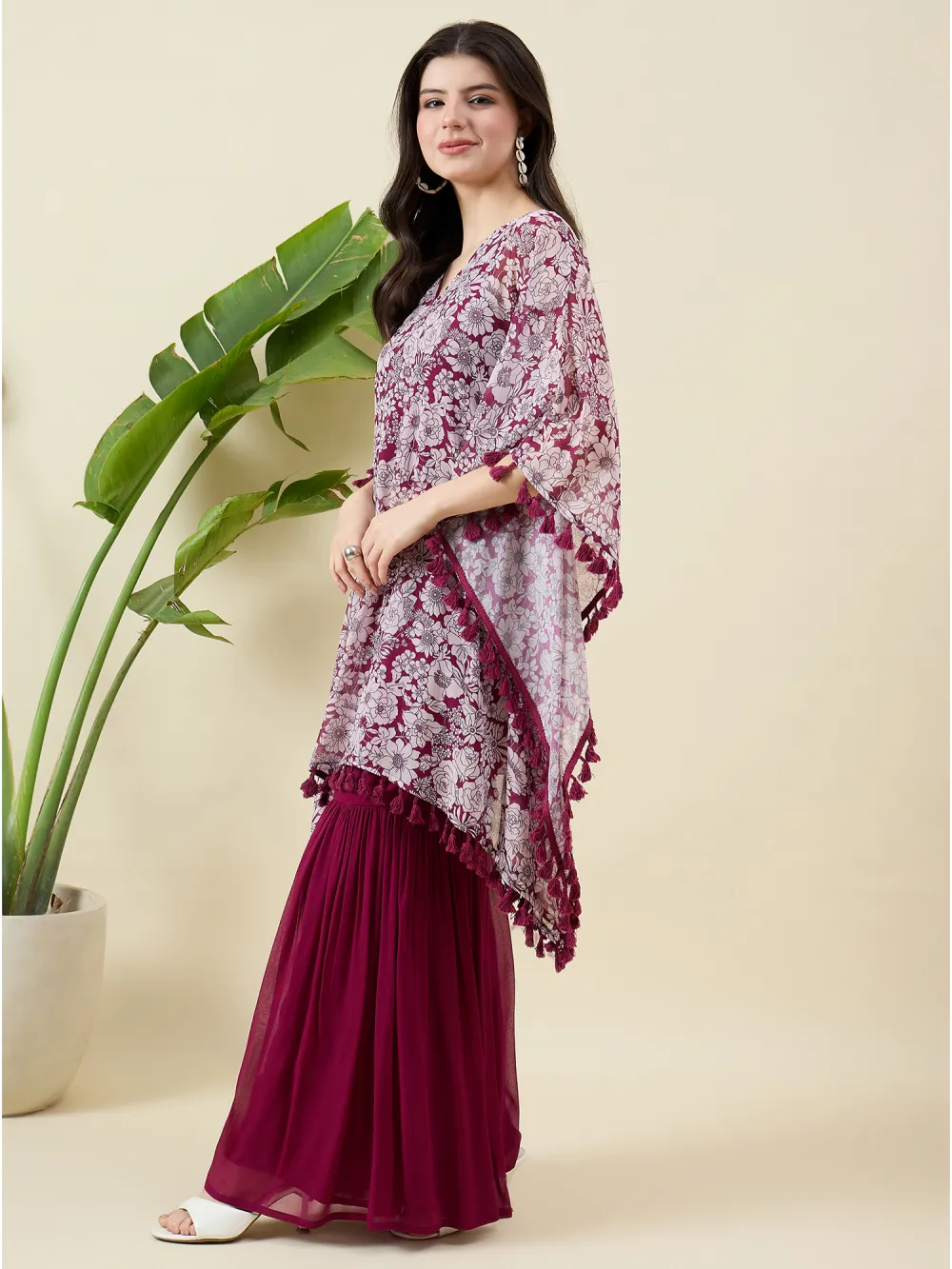 Wine Kaftan Kurta with Palazzo Set in georgette features elegant floral prints that add depth and femininity. The flowing silhouette and luxurious fabric make it a perfect choice for evening gatherings or festive occasions, blending timeless grace with a modern, understated allure.