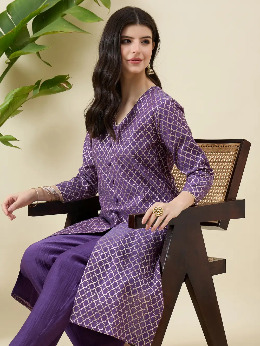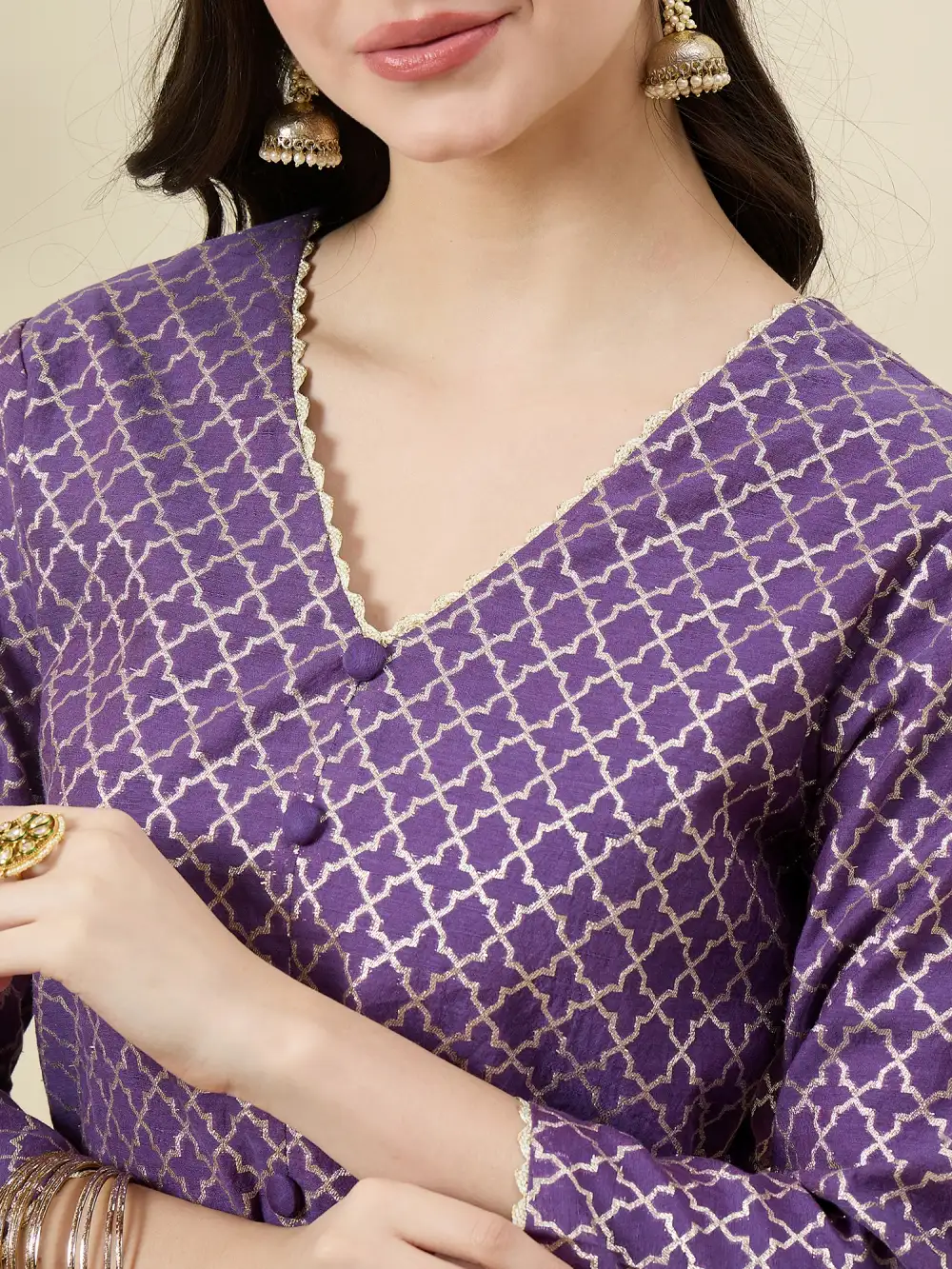 Purple Chanderi brocade showcases the timeless beauty of traditional weaving. With its luxurious texture and elegant silhouette, this ensemble is perfect for festive celebrations. A statement in heritage craftsmanship, it radiates sophistication and cultural grace with every detail.