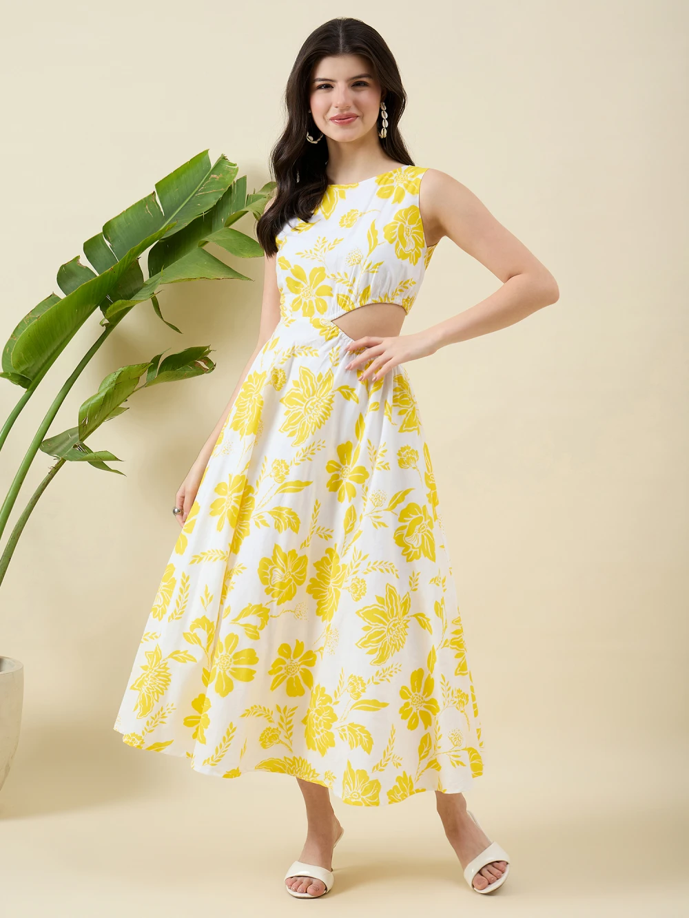 White and Yellow Dress crafted in soft cotton and adorned with cheerful floral prints. The breezy silhouette and sunny hues make it perfect for summer days, casual outings, or festive mornings—blending comfort with effortless, youthful elegance.